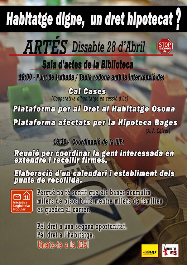 Però des de la CUP hem volgut aprofitar aquesta diada per presentar els punts de trobada que celebrarem a partir d'aquesta mateixa setmana. Per això hem repartit al voltant de 500 punts de llibre amb l'agenta d'aquestes jornades de participació ciutadana (si us heu quedat sense, n'hem repartit per les botigues del poble). Tal com ja vam fer l'any passat abans de les eleccions, els punts de trobada són oberts a tot el poble i han de servir per debatre sobre diversos temes d'interès per als artesencs i artesenques. En aquesta edició, organitzem tres; el primer, organitzat juntament amb Malestar Artés porta el títol Habitatge digne, un dret hipotecat? i hi participaran membres de Cal Cases, i les Plataformes pel Dret a l'Habitatge d'Osona i d'afectats per la Hipoteca del Bages. Serà aquest mateix dissabte 28 d'abril a les 6 de la tarda a la Sala d'Actes del complex cultural Cal Sitjes.